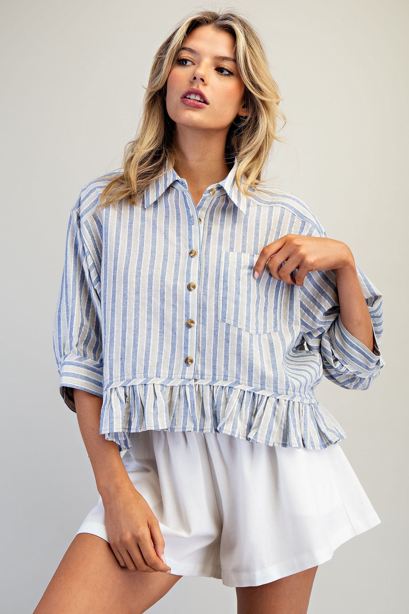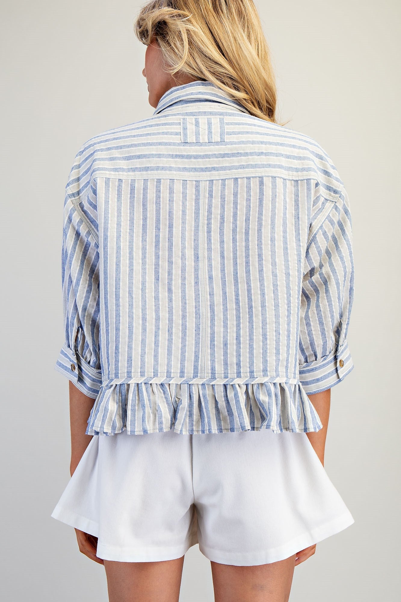 This top features a classic collared neckline and button front closure, drop shoulders with rolled and button tab sleeves, a single chest pocket, vertical stripe pattern throughout, and a relaxed boxy silhouette finished with a playful ruffled peplum hem for a breezy, feminine touch.